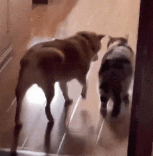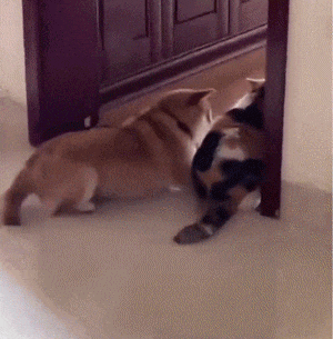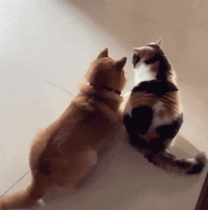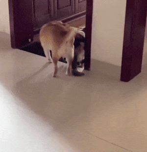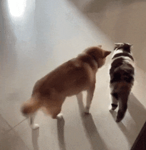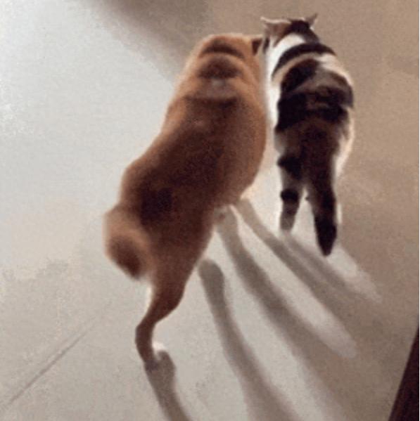 猫咪起身要走,这货立马跟上,还试图和人家玩耍!