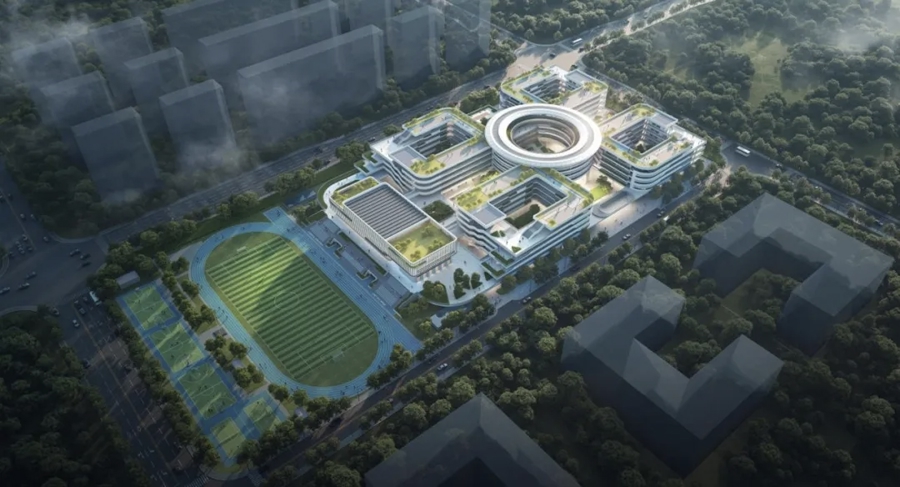 据了解,项目的设计灵感源自杭州市花“桂花”,采用“一环双轴五组团”的布局,通过一个中心活力环与两条景观轴,将东侧教学实验等“静”区与西侧运动生活等“动”区科学分离,通过串联各栋教学楼的中心平台与底层大面积的架空空间,打破了传统校园的封闭感,创造了多层次、开放共享的交流与活动场所,生动诠释了“以人为本”的现代教育建筑理念。