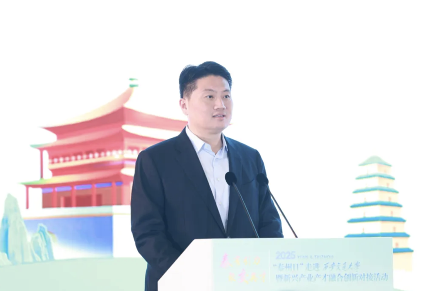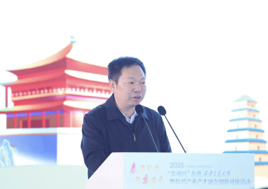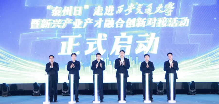 姜冬冬代表泰州市委、市政府对西安交大给予的大力支持表示衷心感谢。在简要介绍泰州经济社会发展情况后,他说,近年来,泰州抢抓“一带一路”和长三角一体化发展的战略机遇,加快建设产业科创强市,全力打造以“大海新晨”为标志的现代化产业体系。近日,泰州队勇夺“苏超首冠”,生动诠释了泰州“三个不相信”的城市精神特质,积极向上、勇于超越的城市风貌。西安交大是一座为民族复兴而生、以西迁精神铸魂的百年学府,培育出一大批国之栋梁,铸就了无数的科研辉煌。泰州与西安交大结缘已久、合作紧密,诚挚邀请各位交大学子从心爱的“仙交大”来到江苏的“凤凰城”,开启属于自己的“星辰大海”。如果选择来泰就业,国家重点实验室等高端平台为你敞开,3万家优质企业“职”等你来;如果选择来泰创业,我们提供最高1亿元的人才专项扶持、单项2000万元的重磅资助;如果选择在泰生活,人才服务私人订制,“凤城英才卡”一卡通享,为你破解“落脚地”“另一半”“下一代”等成长烦恼。热切期盼能有更多与西安交大通力合作、通赢未来的宝贵机遇,让泰州的产业沃土与交大的科研根系共生共荣,结出更多的金色硕果。