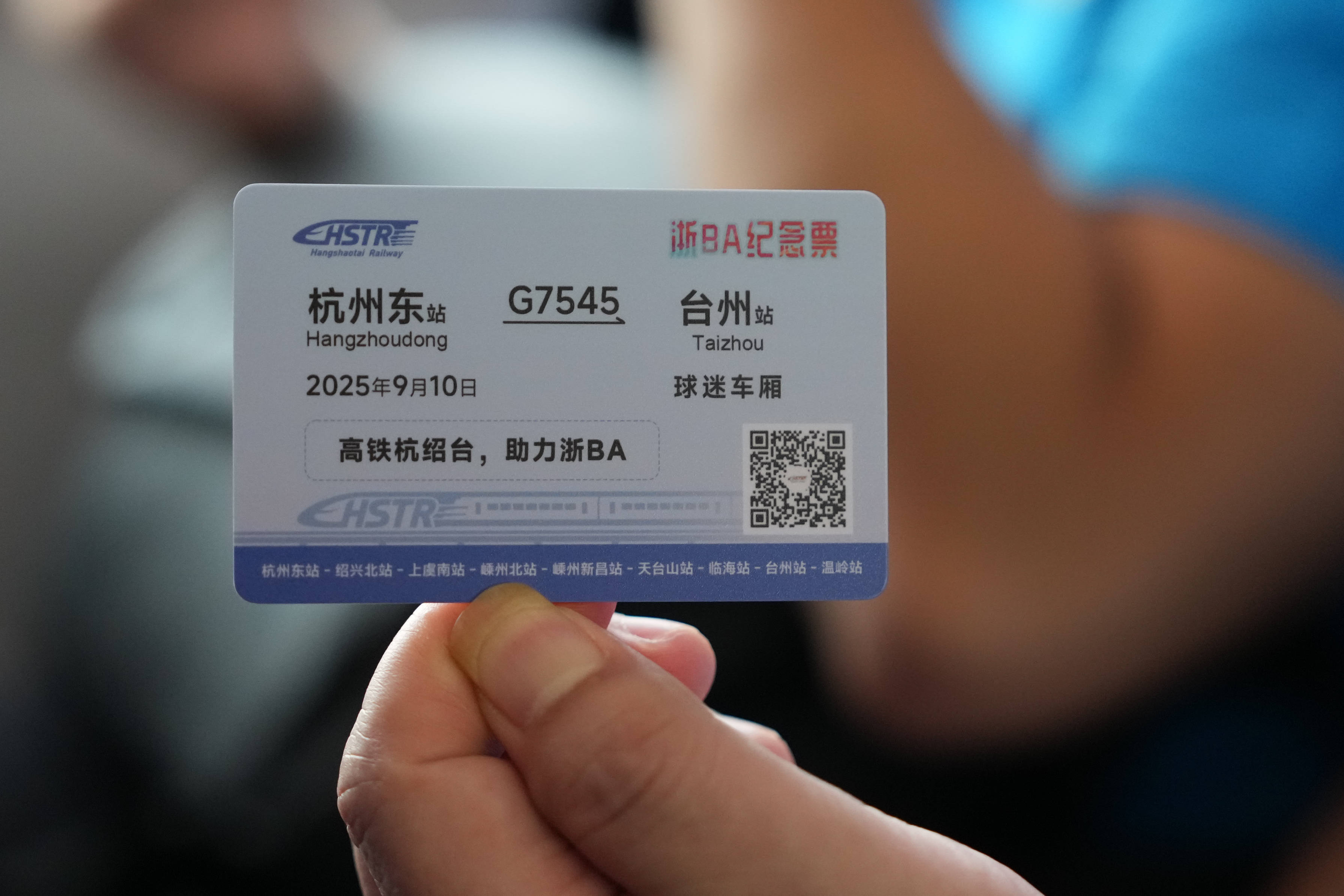 一名球迷展示杭台高铁“浙BA”球迷车厢纪念车票(9月10日摄)。新华社记者 黄宗治 摄票根为钥 消费为链