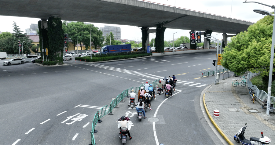目前,上海设置非机动车“二次过街”的路口,往往路幅较宽、进口道较多,交通情况复杂。比如,华夏西路沪南路,周边坐落有红星美凯龙、宜家家居、上海农产品批发中心等强引流点,机动车与非机动车流量密集;华夏西路上方还坐落着中环高架,路口矗立的桥墩“遮挡”了左转车辆的视线;左转弯行驶路线长,非机动车左转时滞留路口出现。“二次过街”方案实施后,该路口的机动车与非机动车各行其道,有效避免了车辆混行与事故的发生。