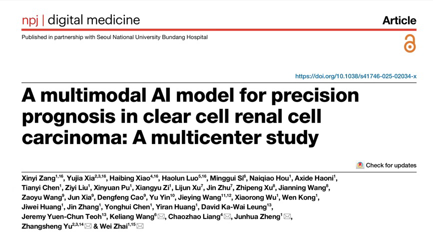 近日,上海交通大学医学院附属仁济医院泌尿科郑军华教授、翟炜研究员团队联合多中心力量,在肾癌精准预后领域取得重大突破。团队研发的多模态预测复发评分(MPRS)模型,成功发表于Nature旗下全球数字医学顶尖期刊npjDigitalMedicine,为透明细胞肾细胞癌(ccRCC)患者的复发风险评估与个体化治疗提供了关键支撑。